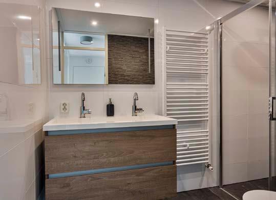 De badkamer is modern en van alle gemakken voorzien. Met een ligbad, inloopdouche en dubbele wastafel biedt de badkamer een luxe en comfortabele plek om te ontspannen. De strakke afwerking en gebruik van hoogwaardige materialen zorgen voor een stijlvolle uitstraling. De badkamer is ruim genoeg voor het hele gezin en biedt voldoende opbergruimte voor al je toiletartikelen.