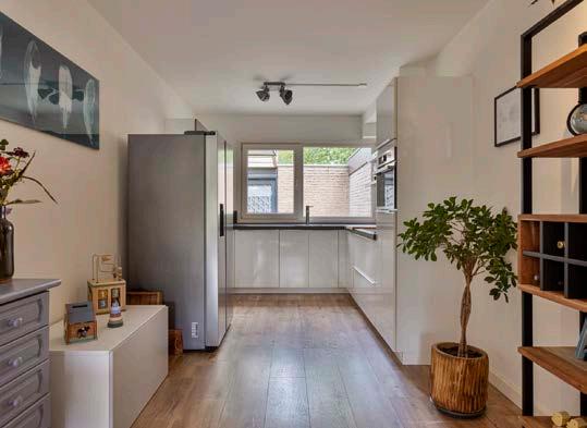 De open keuken is netjes afgewerkt en goed uitgerust met de benodigde apparatuur. De keuken is voorzien van een inductiekookplaat, vaatwasser, oven, koelkast en een afzuigkap. Vanuit de keuken heb je direct toegang tot de tuin, wat ideaal is voor zomerse etentjes buiten.