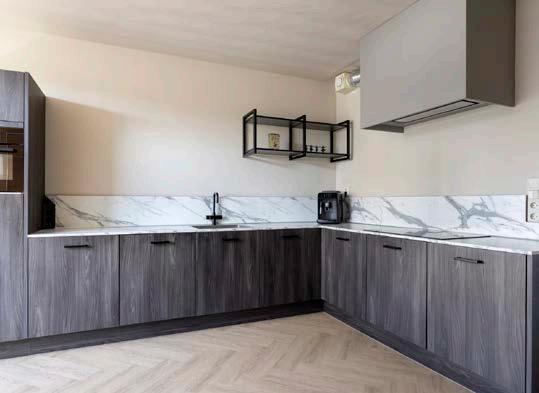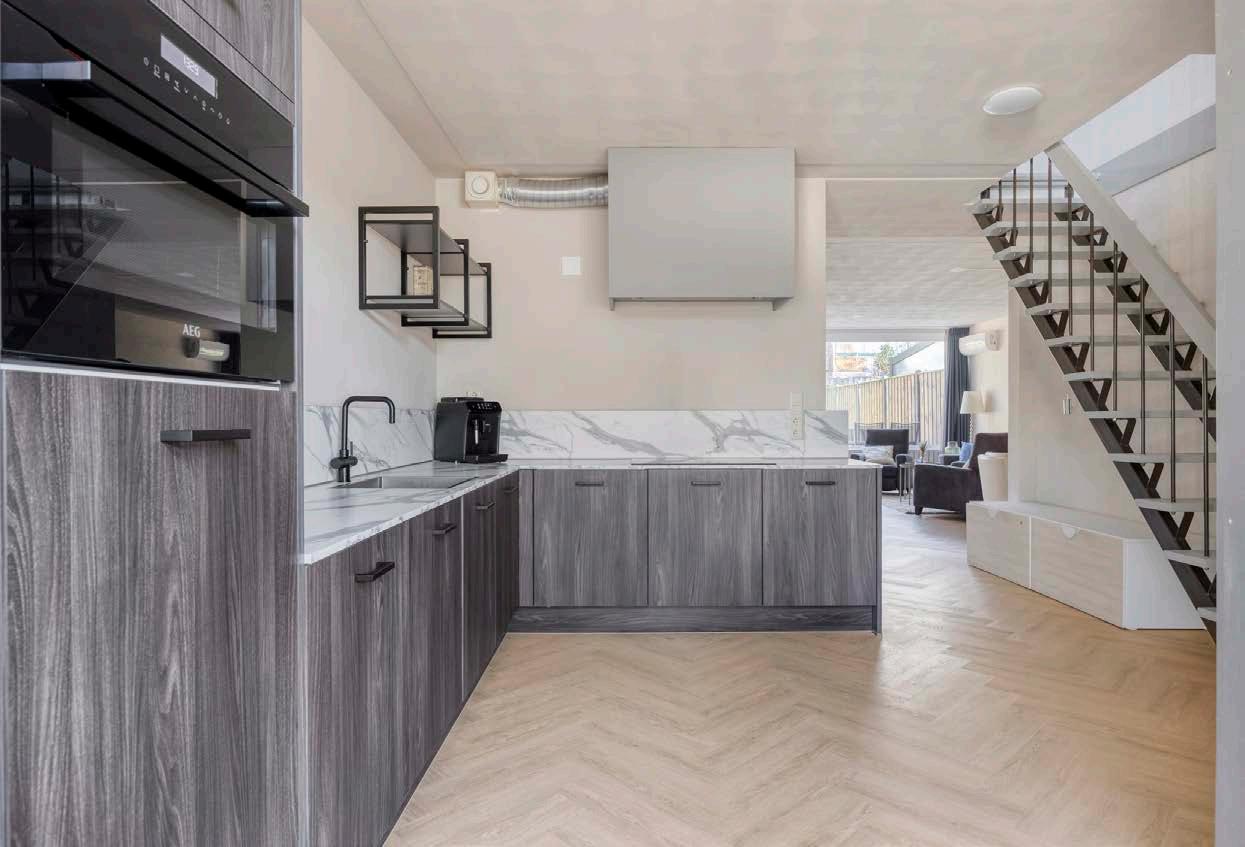 Vanuit de hal, waar zich de meterkast bevindt, loop je door naar de gloednieuwe keuken aan de voorzijde van de woning. Deze keuken is een waar paradijs voor de kookliefhebber. Stel je voor: je maakt de lekkerste gerechten op de inductiekookplaat, terwijl je ondertussen kokend water tapt uit de moderne kraan. Zin in een snelle maaltijd? Dankzij de combi-oven/magnetron is dat zo gepiept. Bovendien vind je onder de strak afgewerkte kasten volop opbergruimte om je keuken netjes en geordend te houden.