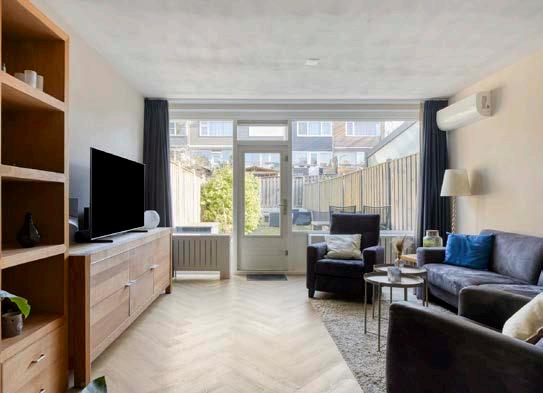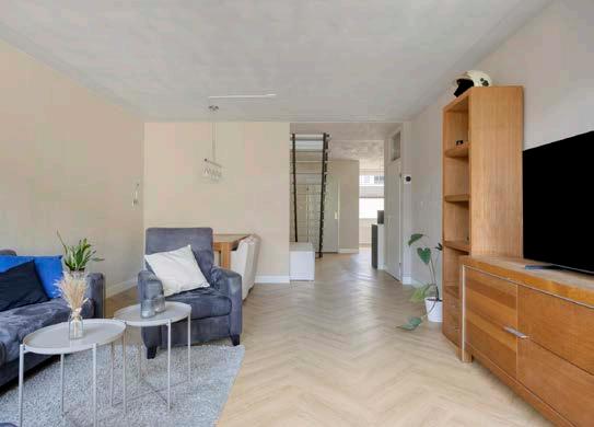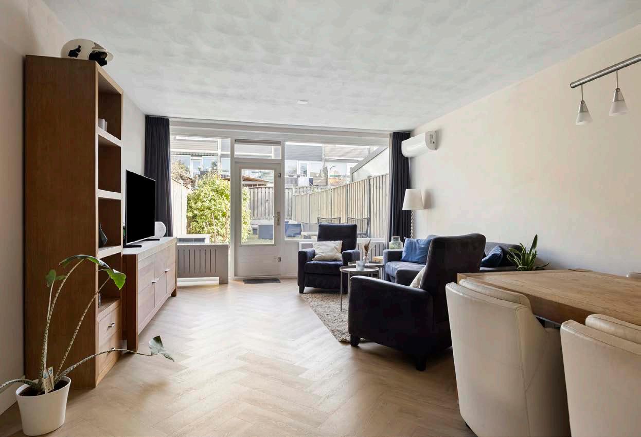 Aan de achterzijde van de woning bevindt zich de sfeervolle woonkamer, die door het grote raam en de deur naar de tuin baadt in natuurlijk licht. De visgraat PVC-vloer en de strakke muren geven de ruimte een warm én eigentijds karakter, waardoor je je hier direct thuis voelt. Zie het al voor je: een gezellige zithoek, een grote tafel voor etentjes met vrienden en familie, en een openslaande deur naar je eigen tuin.