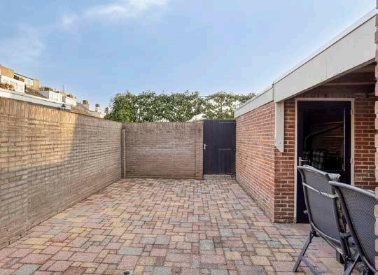 De achtertuin op het zuidoosten is onderhoudsvriendelijk aangelegd en voorzien van een overkapping, stenen berging met elektra en een achterom. Een fijne buitenruimte met relatief vrij uitzicht aan de achterzijde.