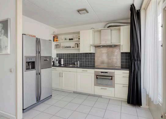 De keuken aan de achterzijde is semi-open en is voorzien van functionele apparatuur, zoals een combi-oven, vaatwasser, kookplaat en afzuigkap. Vanuit de keuken heb je bovendien een direct zichten toegang tot de zonnige achtertuin.