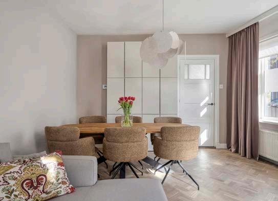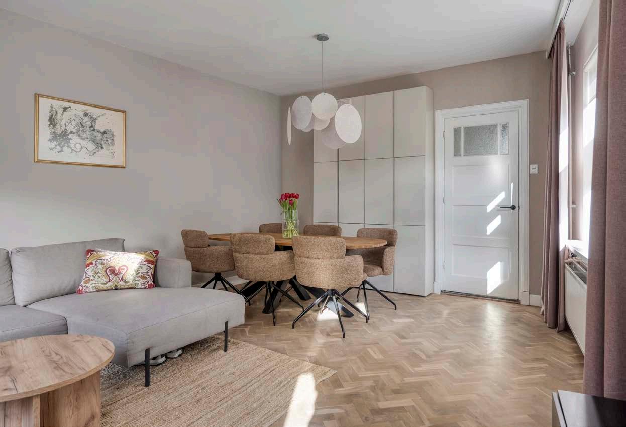 Stap binnen en voel direct de tijdloze charme van deze heerlijke woning. Vanuit de centrale hal – met trap naar boven – kom je in een lichte woonkamer van 28 m². De warme kleuren van het visgraat parket en de grote raampartijen zorgen voor een stijlvolle en uitnodigende sfeer. Gezellig borrelen? Hier is ruimte zat voor een comfortabele zithoek én een eethoek waar je gasten zich direct thuis voelen.