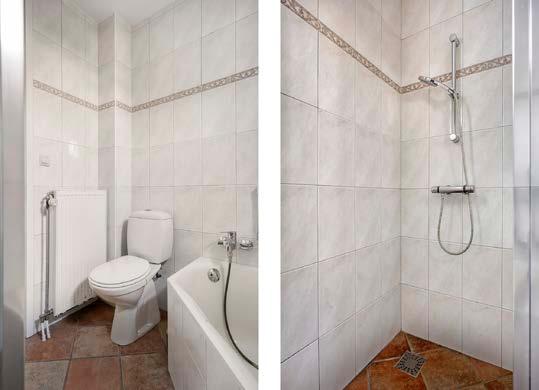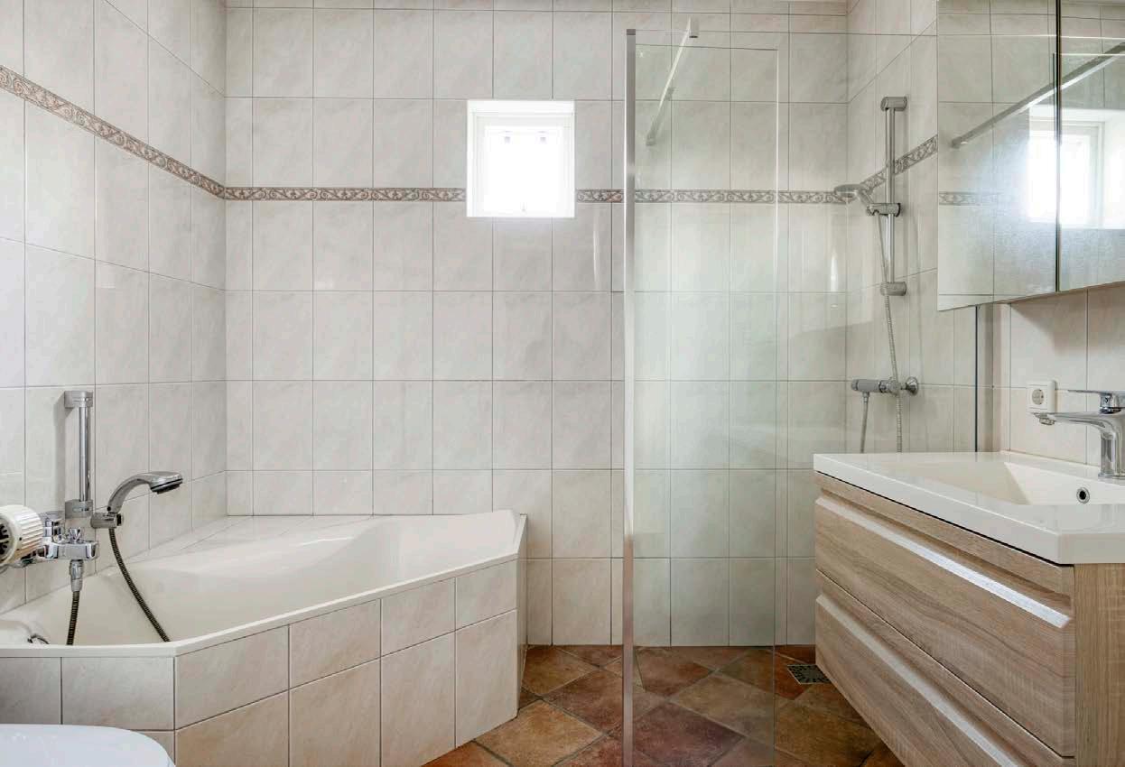 De royale badkamer op de begane grond voorziet in alle gemakken en is praktisch ingedeeld met een ruime douche, een wastafelopstelling, zitbad en het toilet.