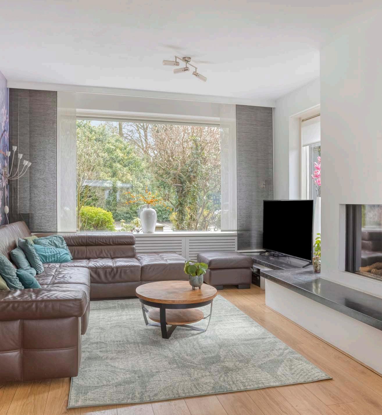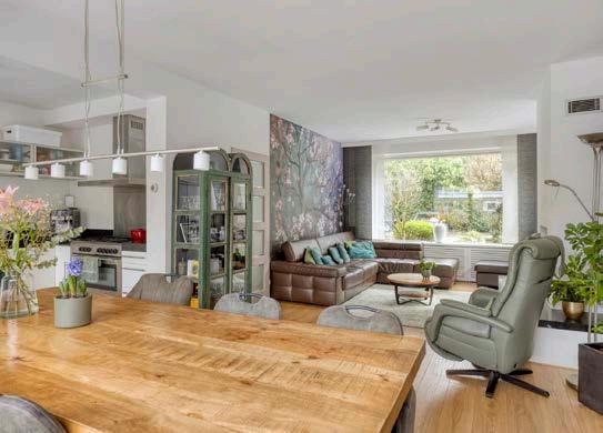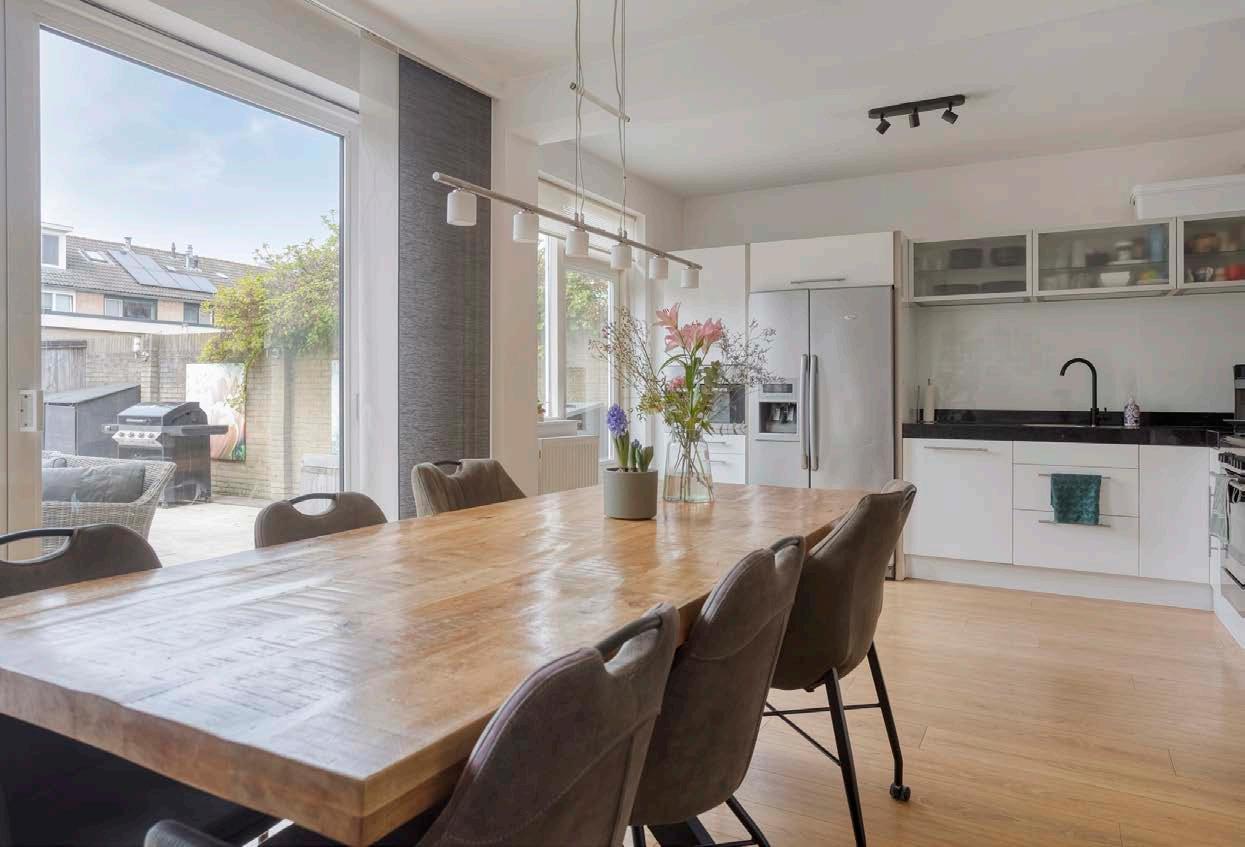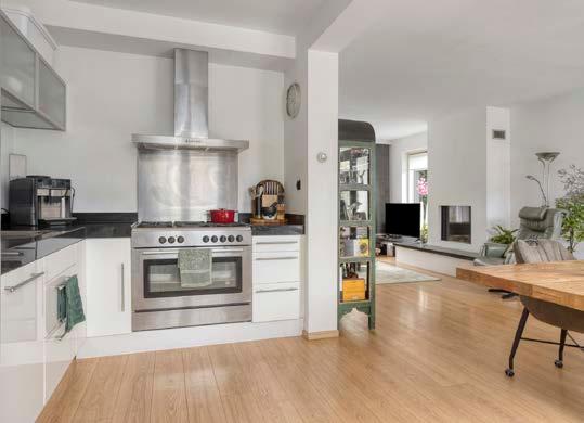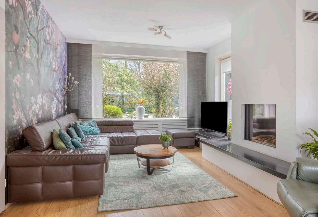 Binnenkomen in deze woonkamer is een feestje! Door de grote raampartijen en schuifpui naar de tuin stroomt het daglicht rijkelijk naar binnen. De Faber-gashaard fungeert als een sfeervolle blikvanger en zorgt voor knusse avonden. Hier creëer je moeiteloos een warme, huiselijke sfeer waar jouw gezin en gasten zich direct thuis zullen voelen.