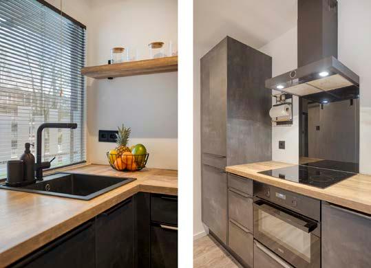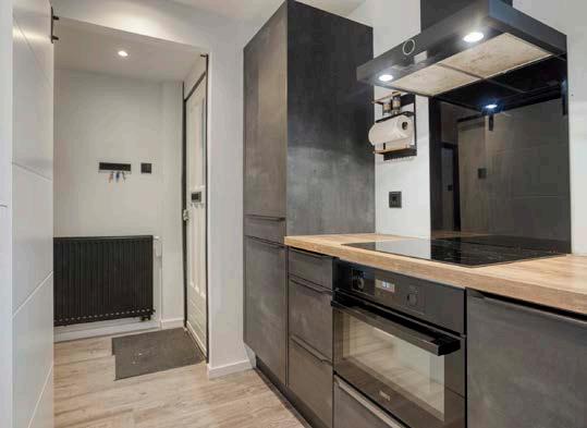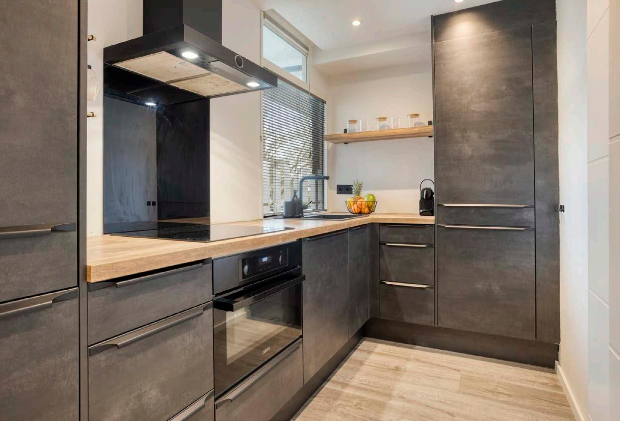 De keuken ligt direct naast de entree aan de voorzijde van het appartement. Met zijn moderne, strakke uitstraling en efficiënte indeling is dit een ruimte waar koken een plezier wordt