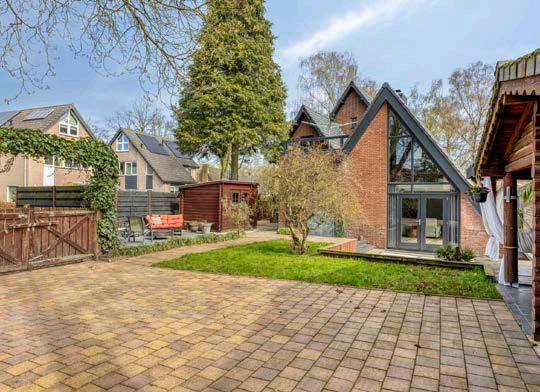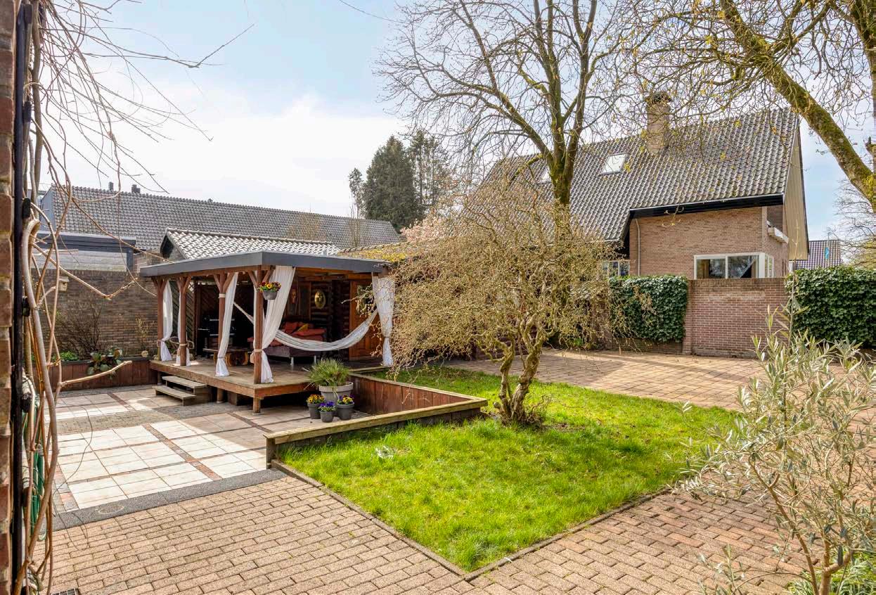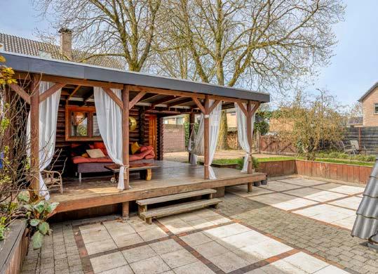 De lichte woonkamer heeft een niveauverschil, waardoor een speelse split-level indeling ontstaat. Vanuit de woonkamer loop je via openslaande deuren de westelijk gelegen achtertuin in, waar je geniet van de rust en het groen, compleet met een blokhut met sauna en een schuur.