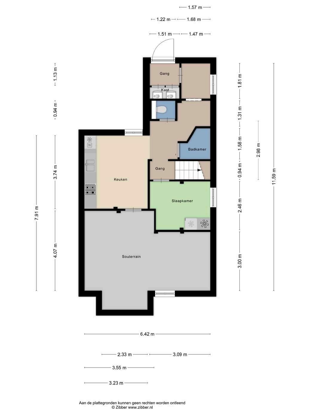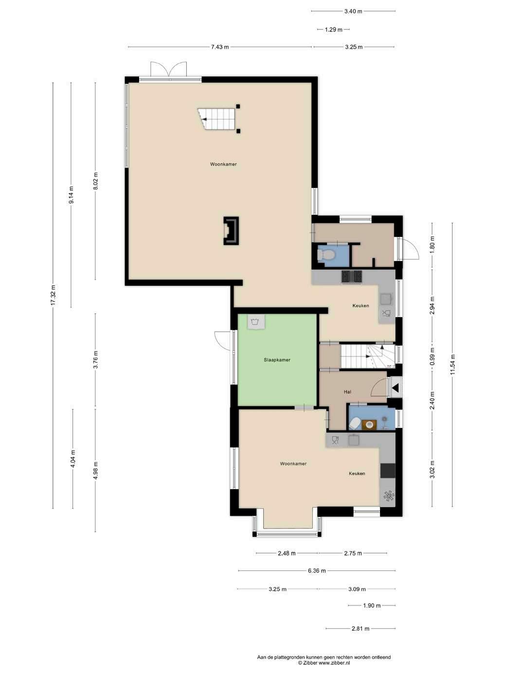Het oorspronkelijke deel van de woning (bouwjaar 1939) heeft aan de voorzijde zijn eigen entree. Achter de linker voordeur vind je een hal met toegang tot een woonkamer met open keuken, een slaapkamer en eigen badkamer.
