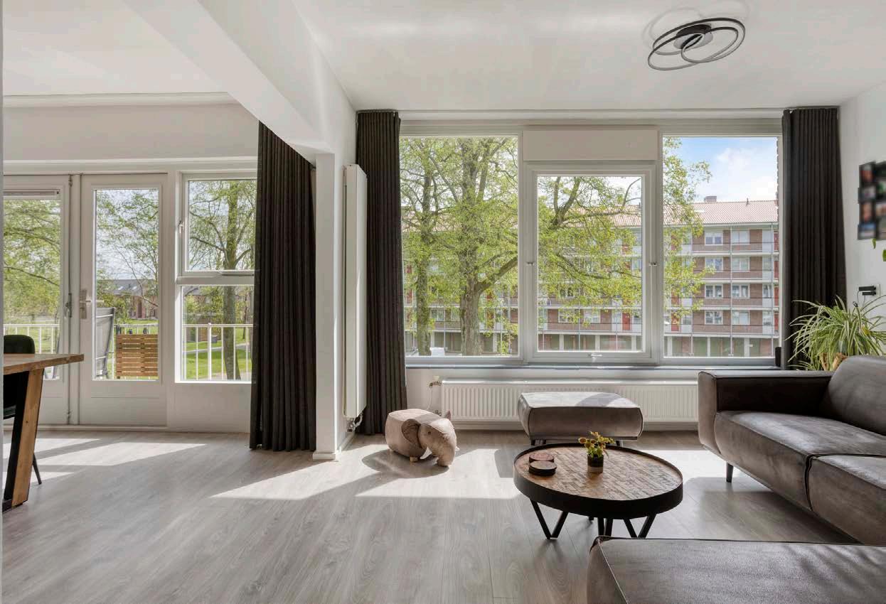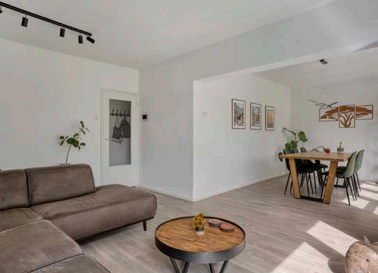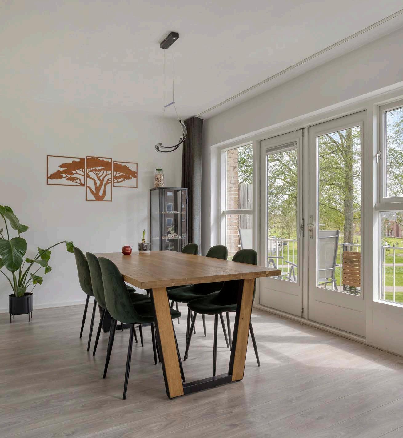 De woonkamer is ruim en licht dankzij de grote raampartijen, wat zorgt voor een prettig en open gevoel. Vanuit de woonkamer heb je uitzicht op het omliggende groen, wat bijdraagt aan de rustige sfeer in huis.
