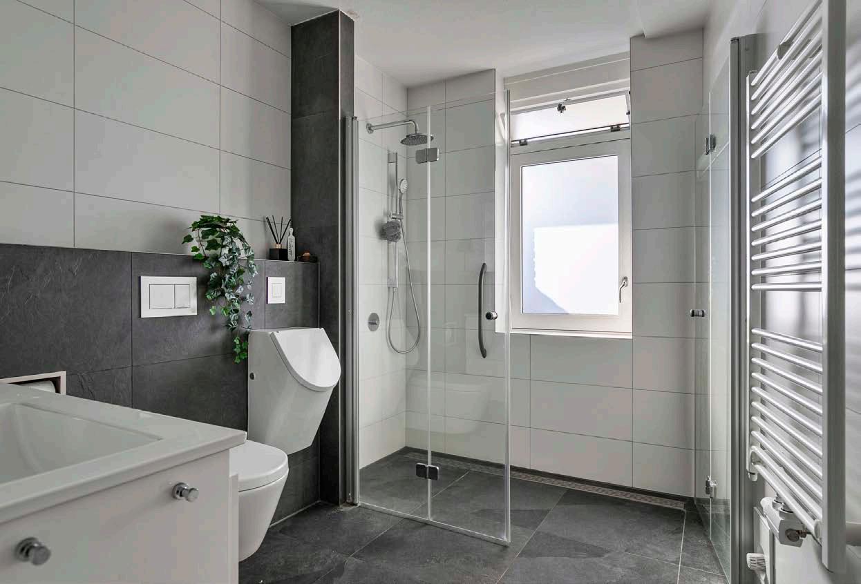 De moderne badkamer heeft een strakke en luxueuze uitstraling die dagelijkse routines tot een plezier maakt. De badkamer is voorzien van een ligbad, inloopdouche, toilet, spiegel en dubbele wastafel met meubel.