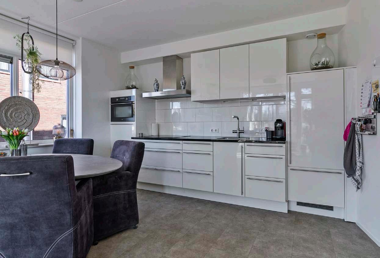 De open keuken biedt moderne apparatuur en veel werkruimte. De keuken is voorzien van een koel-/vriescombatie, combi-oven, vaatwasmachine, vierpits inductiekookplaat, afzuigkap, spoelbak en enorm veel opbergruimte. Dit maakt het niet alleen een functionele, maar ook een gezellige plek om te koken en te eten.