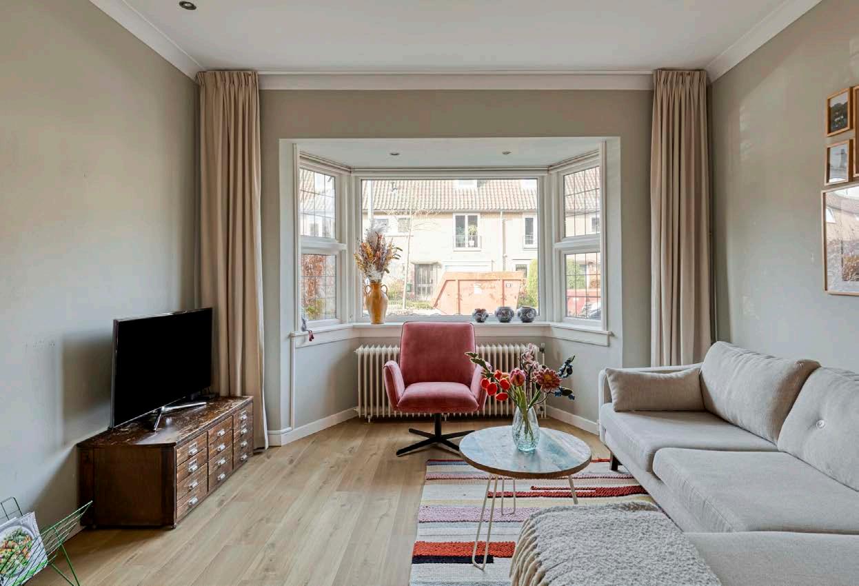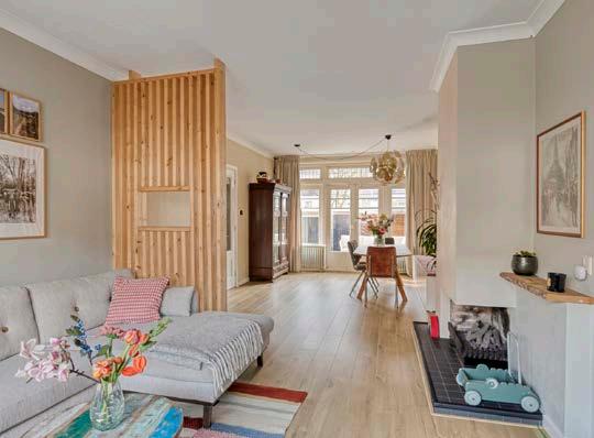 De woonkamer voelt direct uitnodigend aan dankzij de lichte afwerking en de prettige hoeveelheid daglicht die de ruimte binnenvalt. De erker vormt een echte blikvanger en geeft de kamer niet alleen extra ruimte, maar ook een bijzonder karakter. De authentieke glas-in-loodramen zorgen voor een charmant spel van licht en kleur, wat bijdraagt aan de warme en sfeervolle uitstraling van de ruimte. Daarnaast vormt de open haard een centraal en gezellig element in de woonkamer. Tijdens de koudere seizoenen creëert deze een aangename warmte en een knusse sfeer, waardoor het een ideale plek is om samen te komen, te ontspannen of te genieten van een rustige avond thuis.