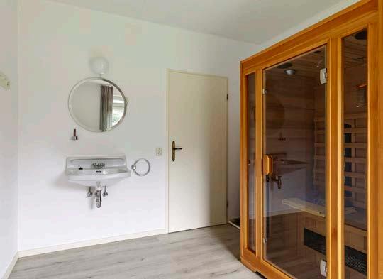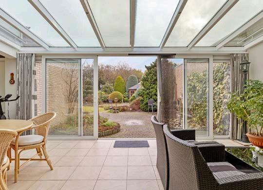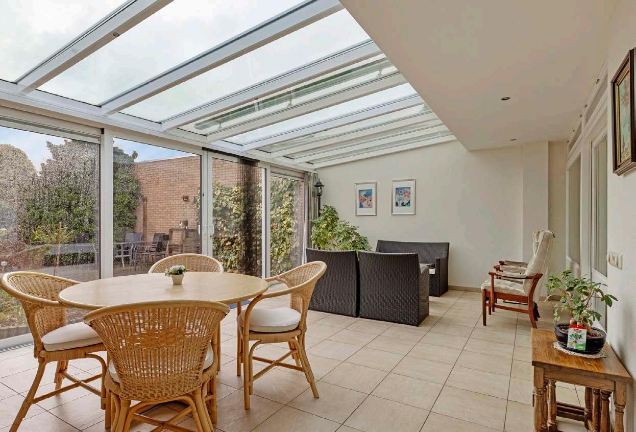 De serre, die ook beschikt over vloerverwarming, grenst aan deze leefruimte. De serre is een fijne toevoeging die zorgt voor extra licht en ruimte, en biedt een mooie plek om van de tuin te genieten, ongeacht het weer.