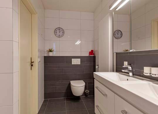 De badkamer is modern en praktisch ingericht, compleet met een ligbad, een royale inloopdouche, een dubbele wastafel, toilet en vloerverwarming. Het zorgt voor extra comfort.