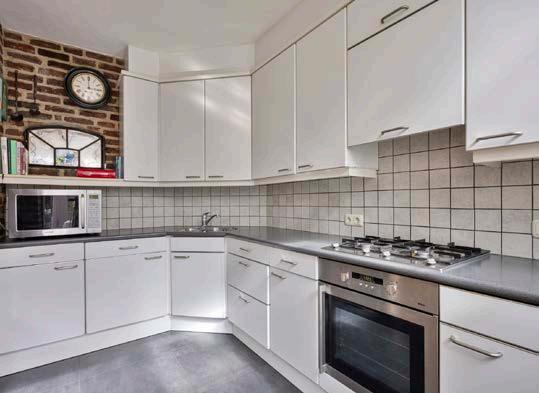De keuken vormt het kloppend hart van het huis, met zijn praktische L-opstelling die koken tot een waar genoegen maakt. Voorzien van een oven, gaskookplaat en een efficiënte afzuigkap, laat het niets te wensen over voor de thuiskok. Het design is zodanig dat zowel het bereiden van snelle snacks als uitgebreide diners moeiteloos plaatsvindt.