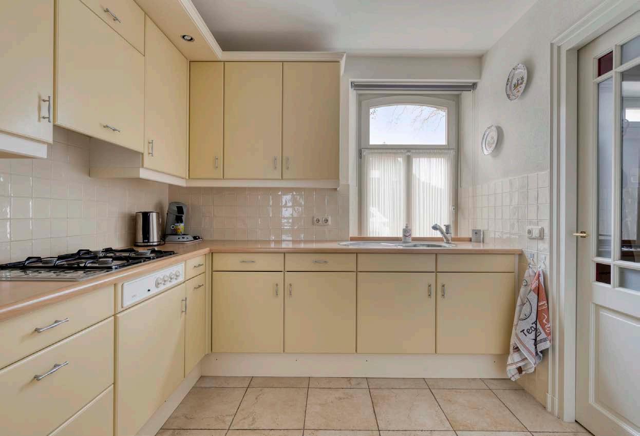 Stap binnen in de ruime woonkamer, waar daglicht vrij spel heeft en de houten details een knipoog geven naar de rijke historie van het pand. Hier is genoeg plek voor een flinke bank, een robuuste eettafel en zelfs een speelhoek, studeerplek of leesarea. De keuken biedt volop werkruimte voor wie een thuischef in zichzelf voelt opborrelen, met een praktische opstelling en vrij uitzicht aan de voorzijde van de woning. Kom binnen, sla een kookboek open en zie het gezin aanschuiven terwijl de geur van een versbereide maaltijd zich door het huis verspreidt.