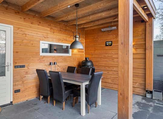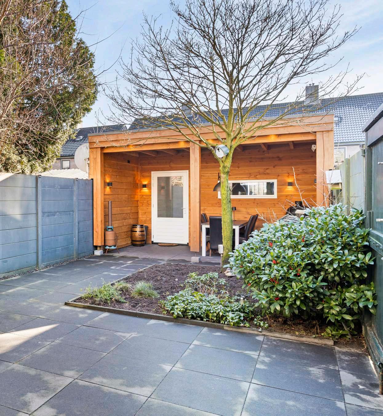 Buiten wacht een mooie, goed onderhouden en riante achtertuin op je. Met een nieuwe overkapping is het de perfecte plek voor een barbecue in de zomer of een warme chocomelk in de herfst. De dubbele poort aan de zijkant en de grote geïsoleerde stenen berging zorgen voor gemak en ruimte. Deze berging is voorbereid met een wateraansluiting en internetaansluiting. En vergeet de prachtige boom niet, die elk seizoen zijn eigen kleurenshow opvoert.