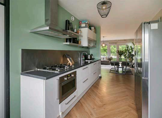 De open keuken is uitgerust met inbouwapparatuur, waaronder een oven, gaskookplaat, en vaatwasmachine. De praktische indeling zorgt voor gemak en verbinding met je gasten of gezin.