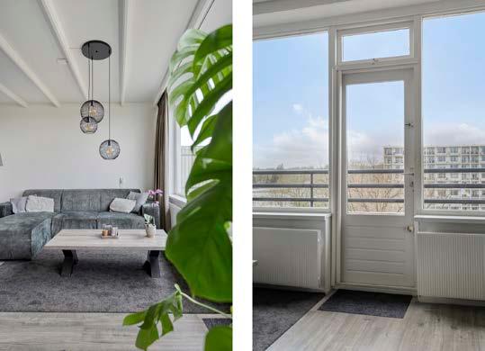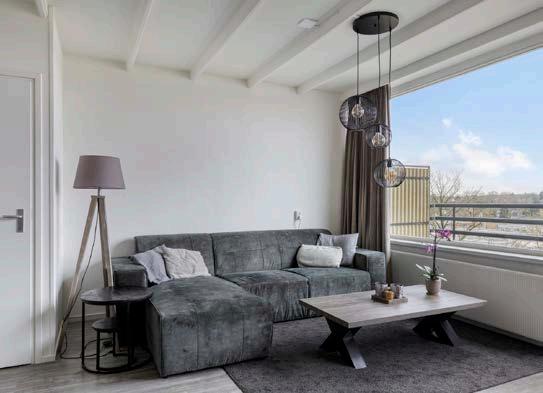 De woonkamer, gelegen aan de achterzijde van de woning, is een van de fijne plekken in huis. Dankzij de grote raampartijen komt er veel daglicht naar binnen en voelt de ruimte ruim en uitnodigend aan. De glazen deur naar het balkon vormt de goede verbinding met buiten. Hier, op het westelijk gelegen balkon, kun je optimaal genieten van de middagzon.