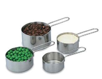 Stackable stainless steel measuring cups with welded rod handles, dual scales, and a no-spill spout. Dishwasher safe.