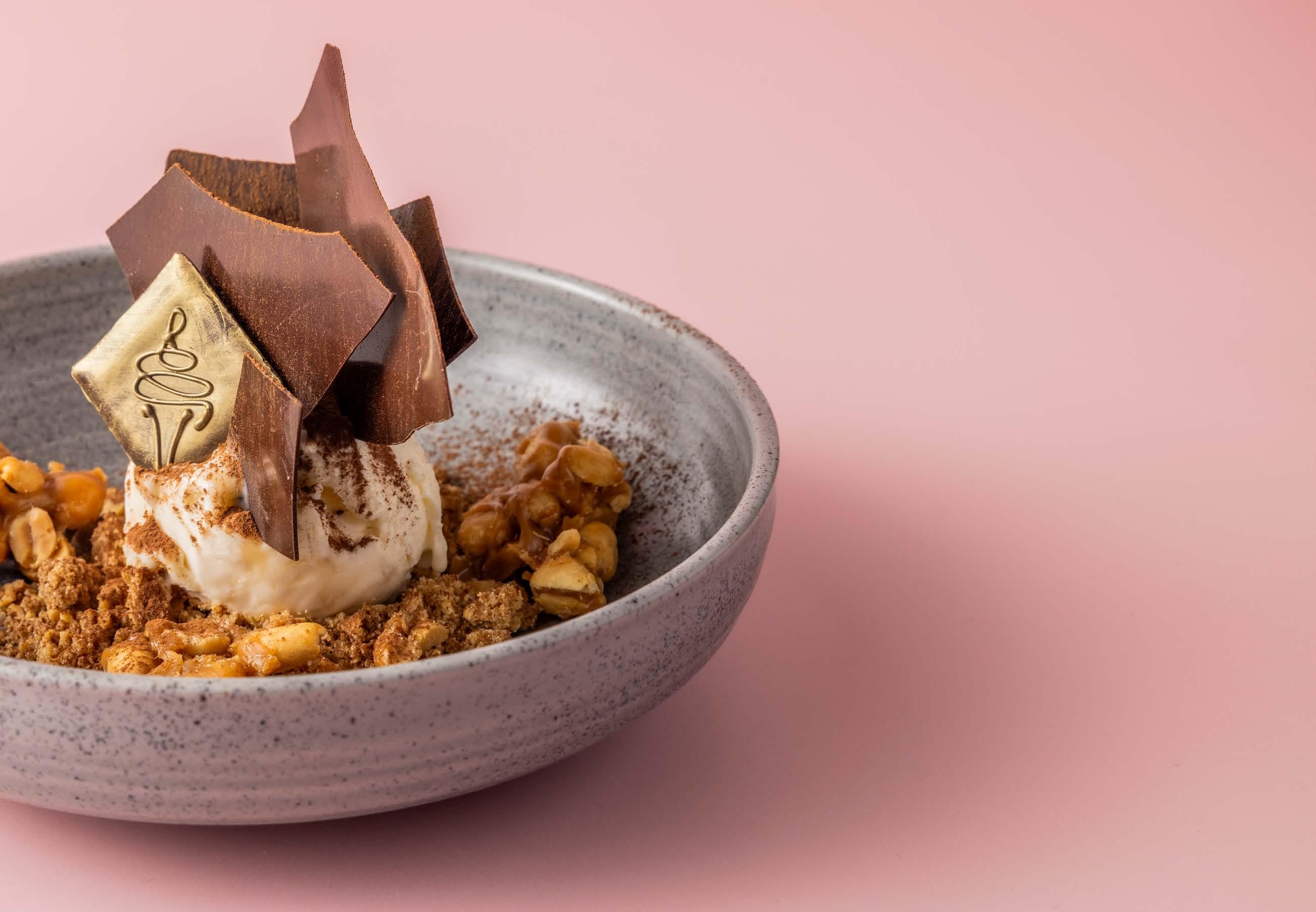 Fløteis med popcornsmak, popcornsaus og sjokoladedragerte maiskrokanbiter