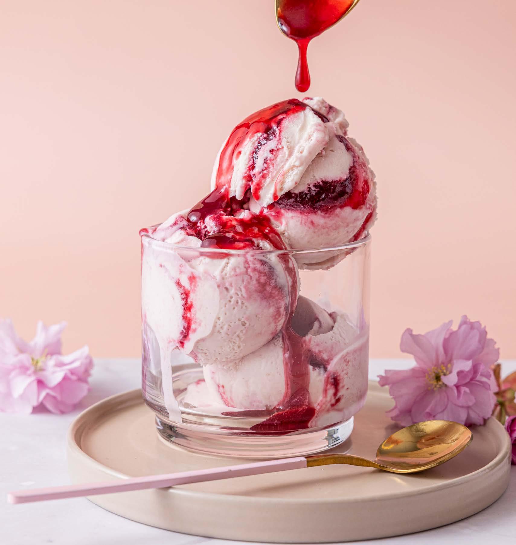 Crème Rosso – En unik smakskombinasjon med sommersorbet og ekte vaniljeis dyppet i en bringebærdrøm.