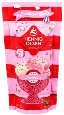Hennig-Olsen Karamellfudge Farget strøssel med mild vaniljesmak. Strøssel med jordbærsmak. Karamellfudge-biter.