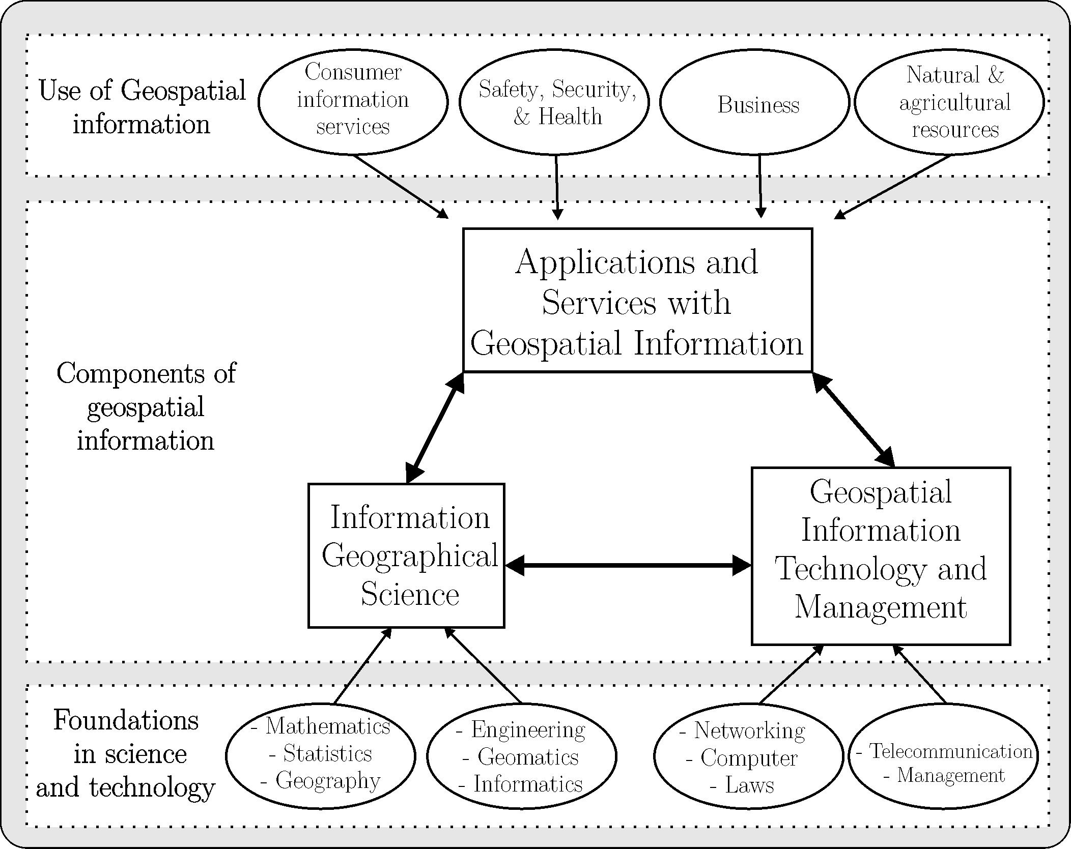 Thegeospatialinformationusedoccursinacontextconsistingofthesetofknowledgeacquired inscientificresearchandgeospatialapplications,technologiesappliedtodevelopandmanage computersystemsandtheinstitutionscreatedtofacilitatetheacquisitionanddevelopmentof geospatialinformation.Thecontextofgeospatialinformationaffecteddifferentsectorsofthe economy(Figure1.1)(LoandYeung, 2007).