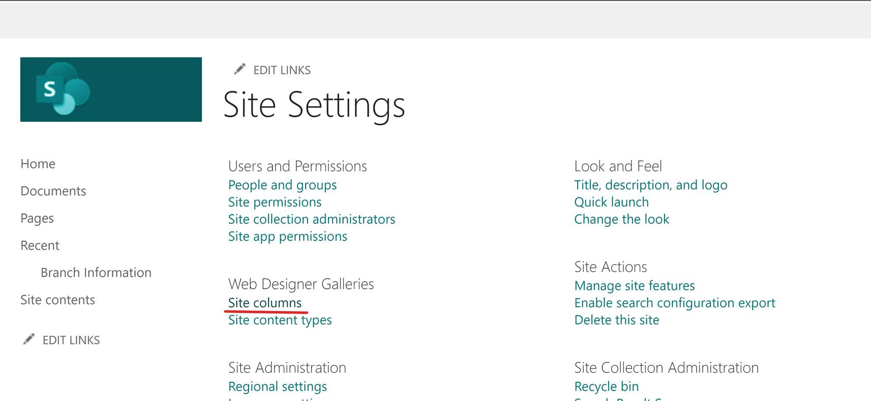 In the Site Settings interface, click the Site columns, as shown in Figure 1-15, to get to that interface.