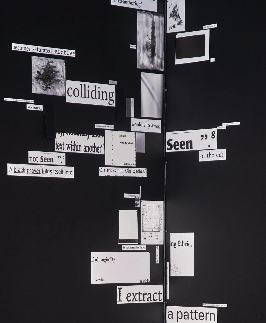 While trying to craft an artist statement, I wrote: I examine the materiality of wayward language—acrobatic (Clarice Lispector) sentences with trapdoors (Fred Moten), runaway syllables that scatter to the marooned edges of a page, words that escape the orbit of their mother sentence, footnotes that consume their reference, and