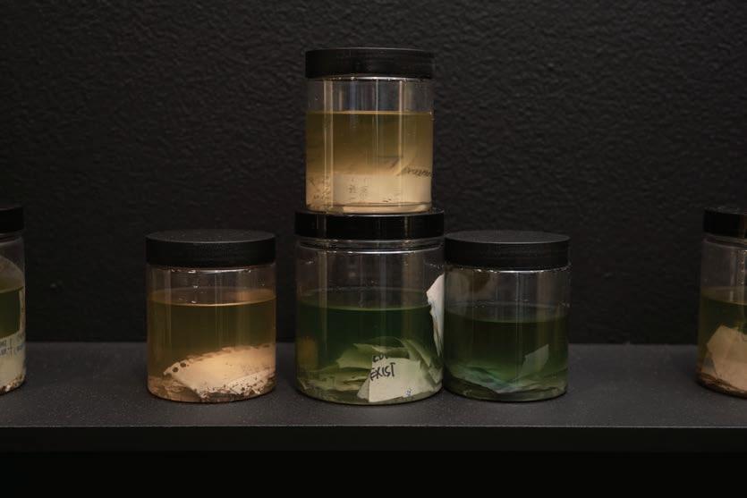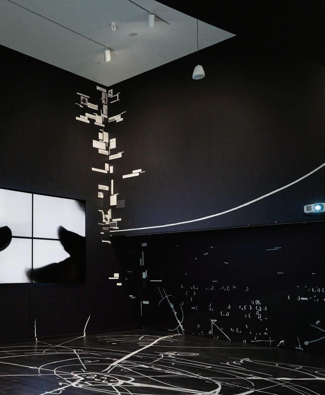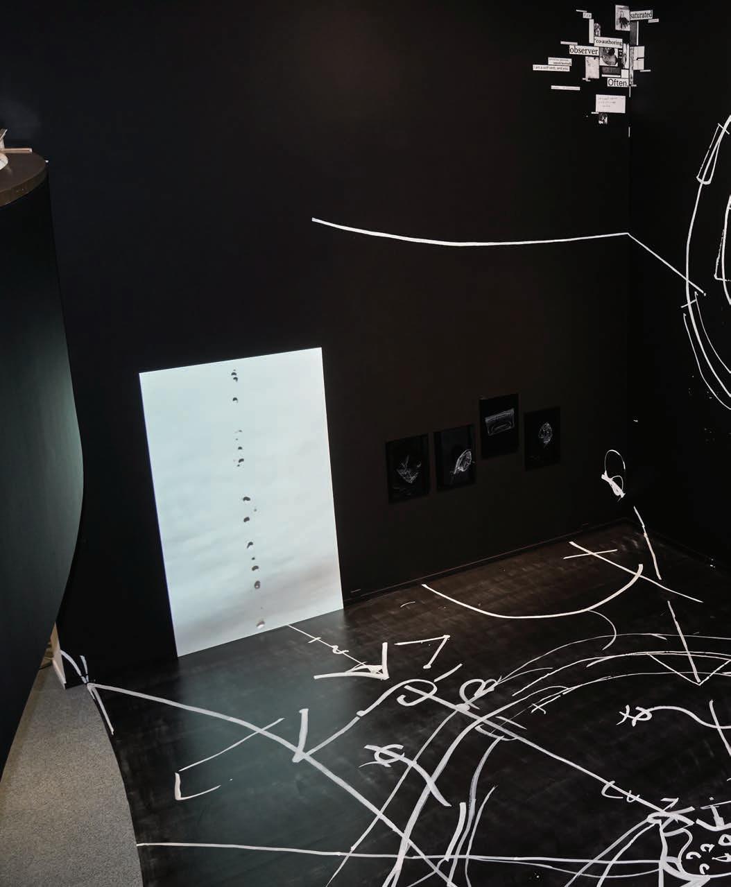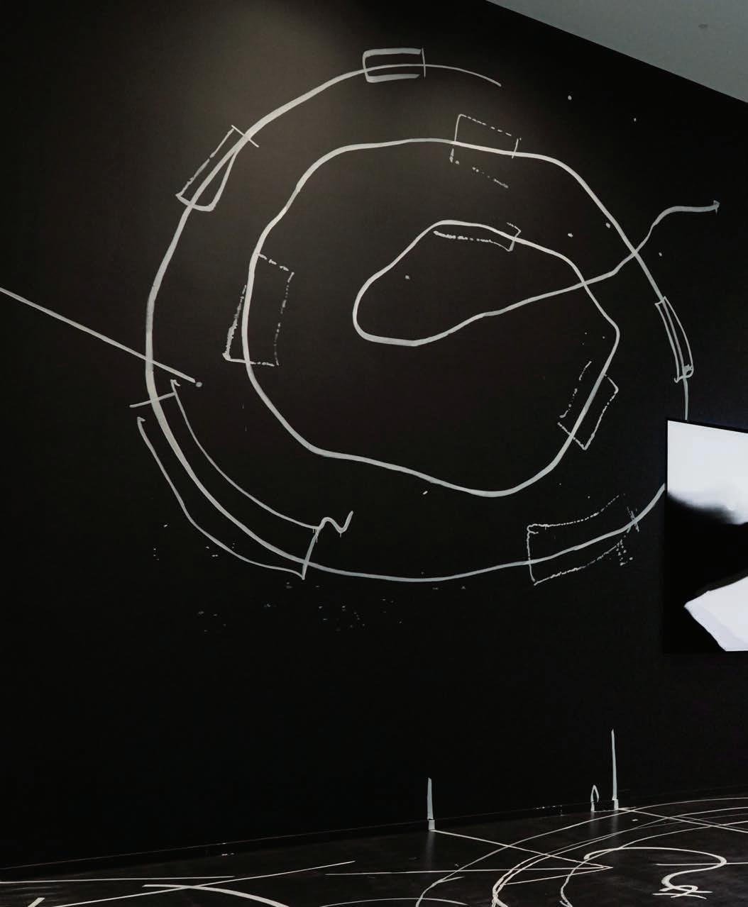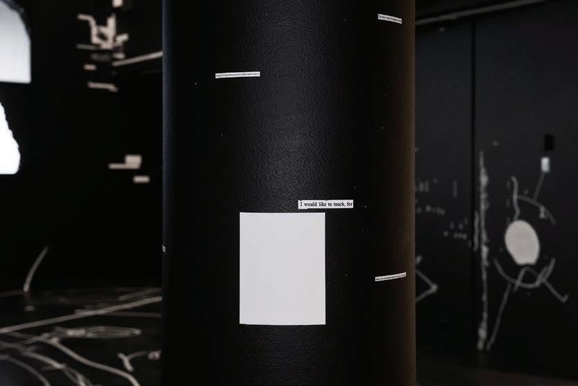 Rasheed’s immersive environment is a spatial manifestation of evading constraint through expansion, with words and marks pressing upon the boundaries of the gallery walls and exceeding the edges of the frame. In video, sound, photography, text collage, and architectural mark-making, Rasheed experiments further with fluidity and liquidity as a means of resisting containment. Liquid is present as both a material and a condition, characterized by shifting forms that evoke a continual process of becoming. These marks and interventions in the space function as speculative escape routes that reimagine imposed limitations as thresholds of possibility.