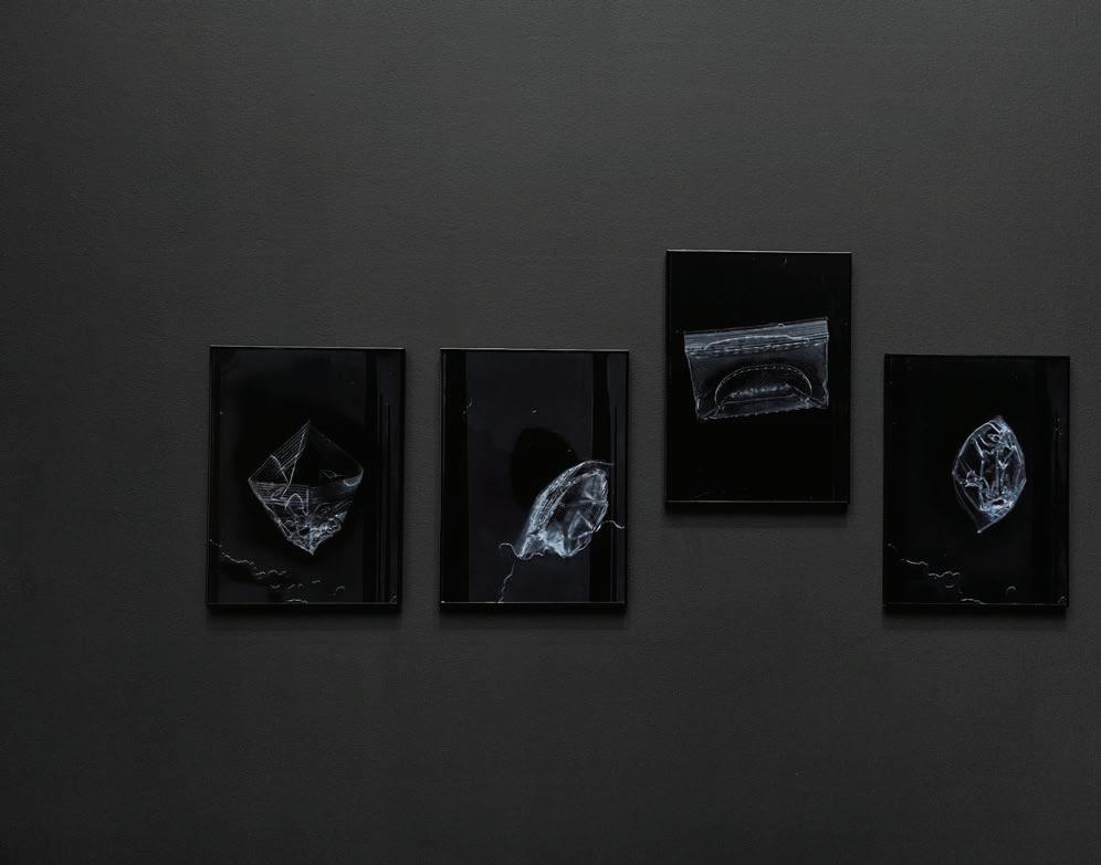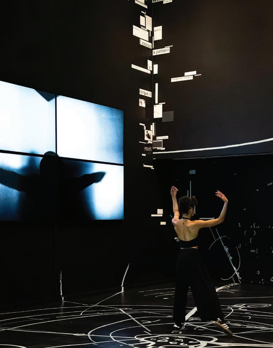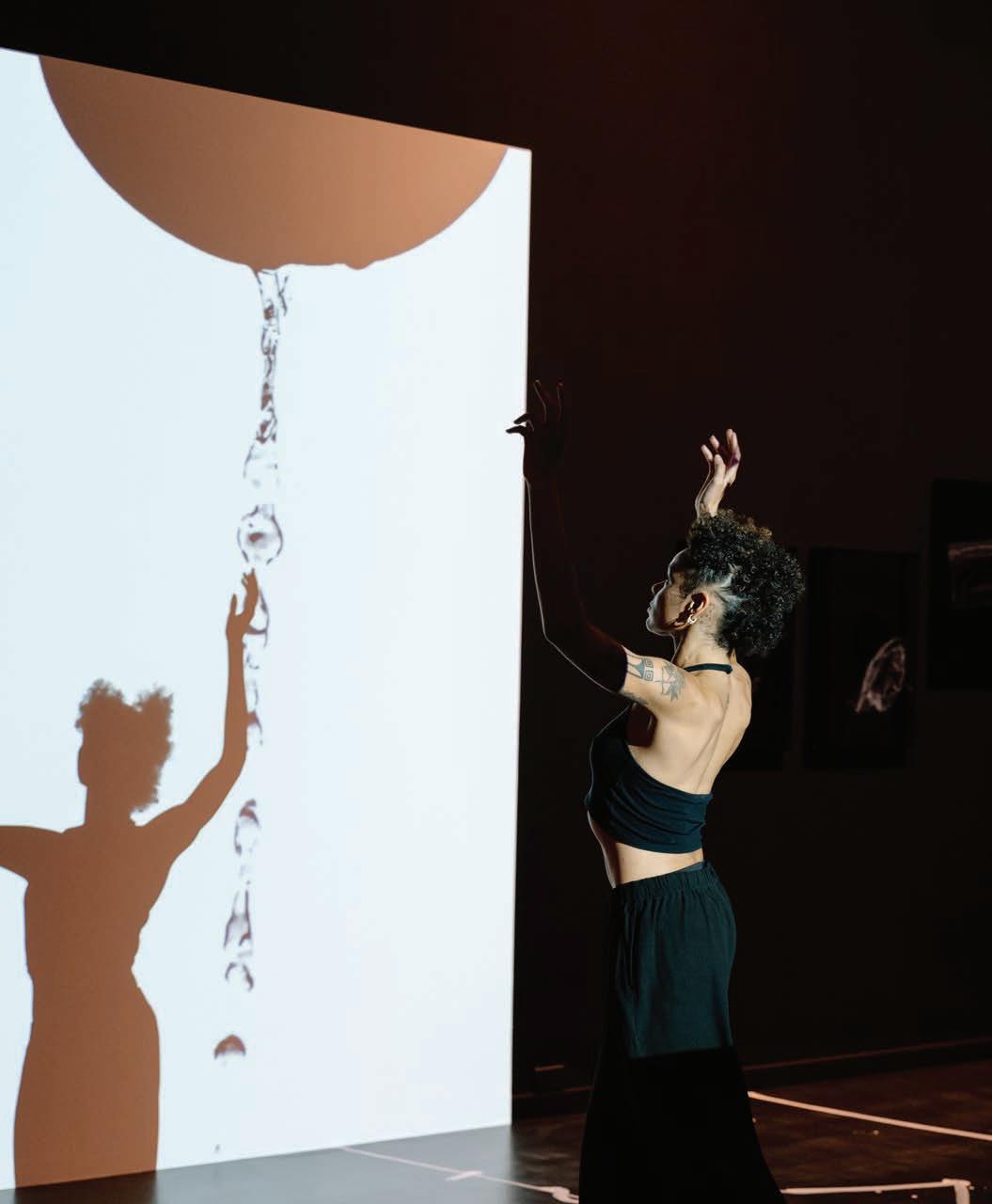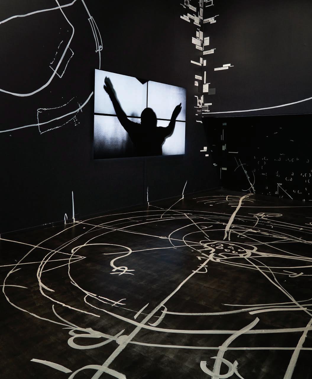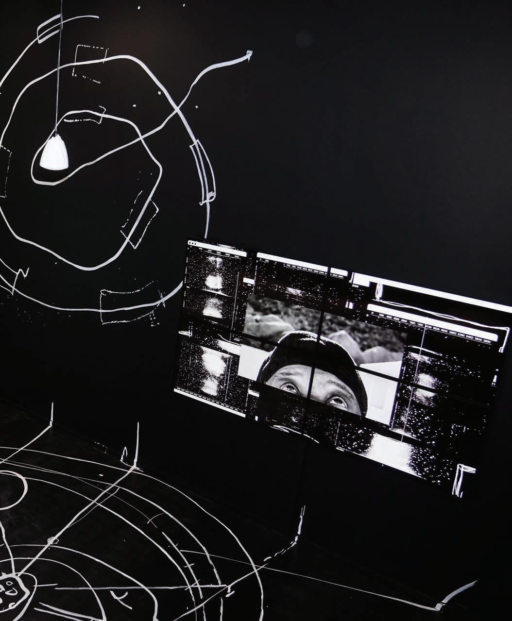 Rasheed’s immersive environment is a spatial manifestation of evading constraint through expansion, with words and marks pressing upon the boundaries of the gallery walls and exceeding the edges of the frame. In video, sound, photography, text collage, and architectural mark-making, Rasheed experiments further with fluidity and liquidity as a means of resisting containment. Liquid is present as both a material and a condition, characterized by shifting forms that evoke a continual process of becoming. These marks and interventions in the space function as speculative escape routes that reimagine imposed limitations as thresholds of possibility.