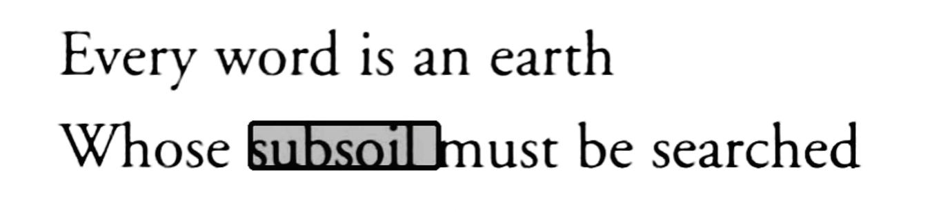Topsoil on the other hand is the upper layer of soil and has the highest concentration of organic matter making it the site of a majority of the biological soil activity. Perhaps a word’s topsoil is the most active and variable layer, where linguistic matter is activated as it is used in everyday life in variable and sometimes unexpected ways. So perhaps Glissant is inviting us not just to explore its contemporary uses, but to undertake deeper lineage work to discover the capacity of a word, its history.
