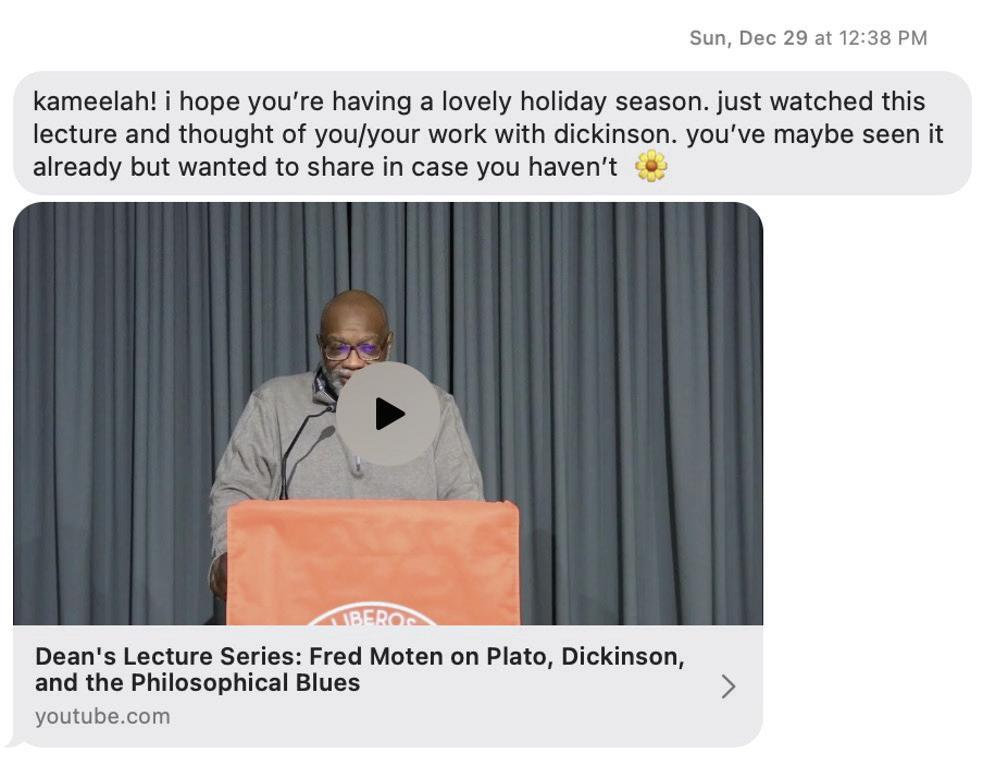 Good morning Kameelah! Thank you for your voice memo—so grateful to hear you craft this thorough exegesis and to hear the sound of the birds! Oof wish I could've cosplayed as a Yale student and taken that course… love Lispector as you know and love the questions you are opening up through that line in Agua Viva. Thanks for pointing me towards Freedom Time—haven't yet read it and you're the second person to remind me to do so in one day!