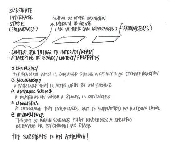 KJR: The substrate as stage! The stage, or the zone of possibility that holds up your world, is love. I think we could expand this to think about substrates/zones of possibility that are foisted upon us. Your substrate is the love that guides you through the world. What might be my substrate? Maybe this is really a question of what the community is that makes you and what you put into the world possible?