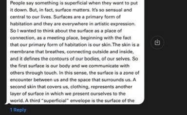 A surface is a boundary; the substrate is the whole, active, agentive thing. This slip-up is generative, at least for me. Perhaps I should consider not remaining at the boundary of an idea or methodology, but rather, I should embrace transgression as a form of responsibility amidst the “sacred motivations” that influence our wandering. The study (study in the Moten sense, “things you do with other people”) must be rooted in a certain non-compliance with the expectation to stay at the surface, as you say later of Chandler’s essay.