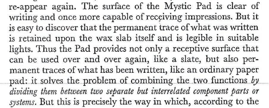 ZH: An Interjection – I want to make a quick interjection after reading this and listening to your voice memo. The technology of the voice memo reminds me in some way of Freud’s essay “A Note Upon the ‘Mystic Writing Pad,’" where he describes a device that is capable of instantly erasing anything written upon its surface. I think of this as language going back into itself… evacuating the world to return to some vast [9], unmarked space of pre-articulation. But (in a kind of Ashon Crawley way) I’m interested in thinking of this erasure/ unmarking/void—this return of the return of language to the kind of absence which frees it from the logocentric privileging of presence [10]—as a kind of excess rather than as solely negativity… or in that “lack worth having” to use Pope.L’s words.