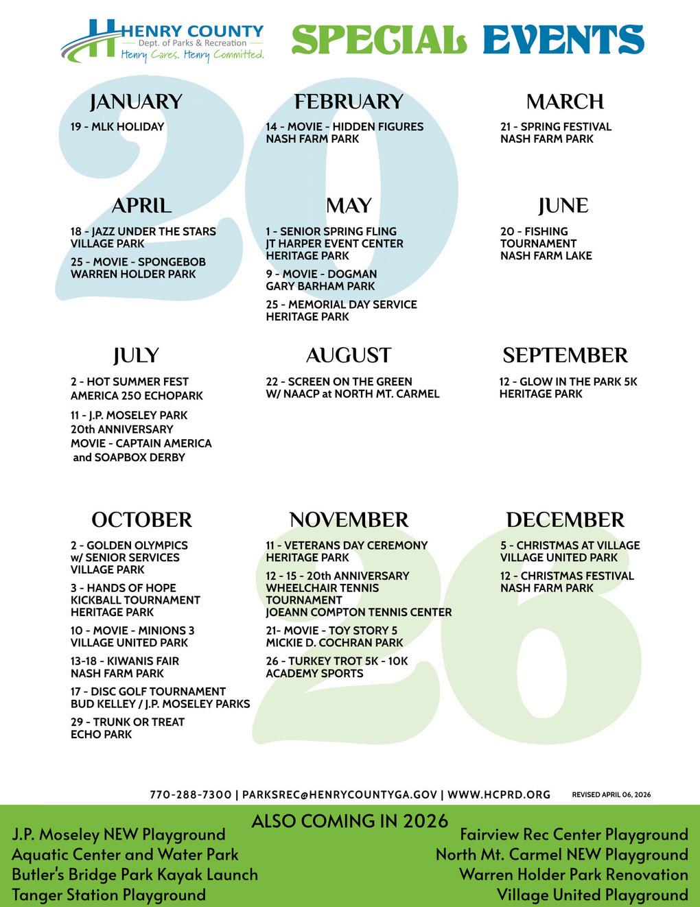 Quarterly recognition in the Parks and Recreation Quarterly Program Guide, an email blast that goes out to over 13,000 Henry County residents. It is also shared and pinned to our social media platforms