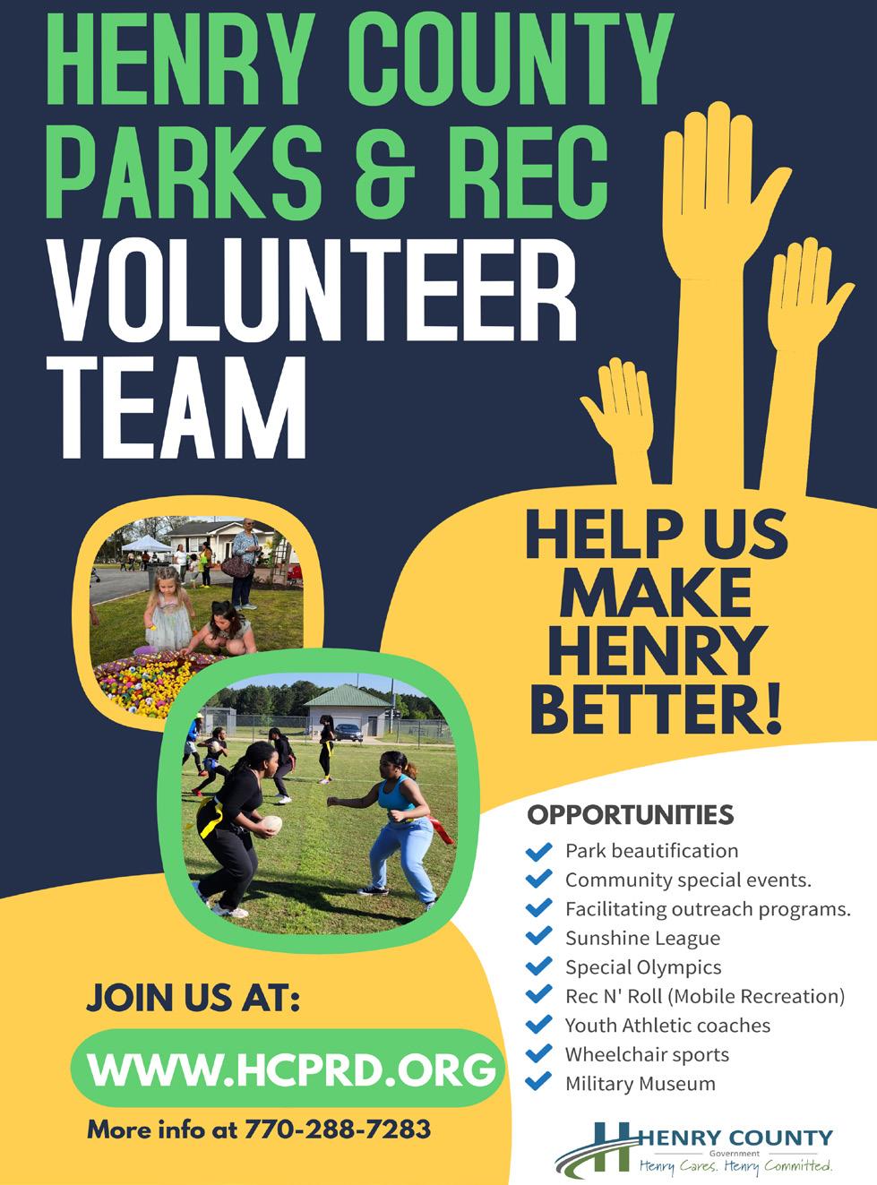 “Henry Cares. Henry Committed.” is not something we just say. It’s a belief that defines who we are as a county. That message has never rung so true as right now. As summer dawns, we embark on a new adventure that is transforming Parks and Recreation. We are redefining the role of Park Maintenance, expanding Athletics with a commitment to inclusivity, deepening our commitment to academic recreation, and streamlining our dayto-day operations. We’re reaching more and more people every day with our promise to provide excellent, caring, committed service to the people of Henry County. Tim Coley constantly reminded us that everything we do is about the people. We work when they play. We provide them with experiences they will remember. We better their lives. Tim Coley taught us what it meant to be Henry Committed, and as we carry out our mission to you, we remember him and the lessons he taught.