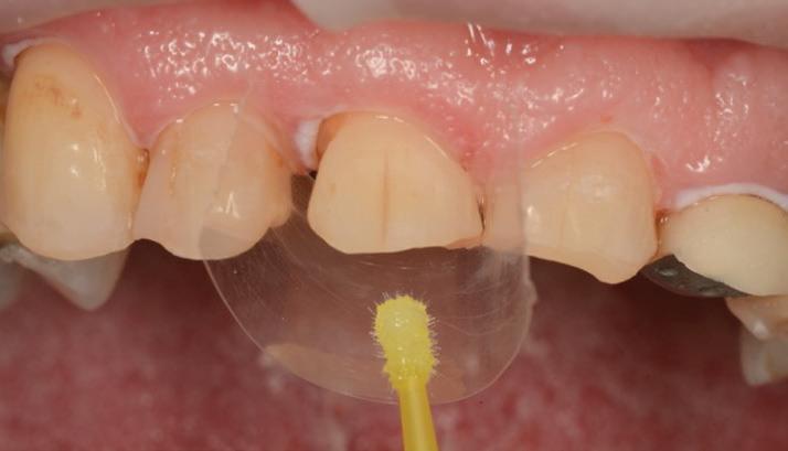 The maxillary anteriors were then isolated one at a time, and a selective etch adhesive protocol was used with the adhesive OptiBond™ Universal by KerrTM (Fig. 8).