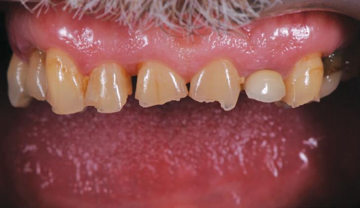 After his examination appointment, it was clear that the two premolars in the upper left quadrant had significant apical pathology and could not be predictably treated. His remaining dentition showed generalised attrition subsequent to dental erosion from gastric reflux, and his lower anteriors showed recession and some loss of periodontal support (Figs. 2, 3).