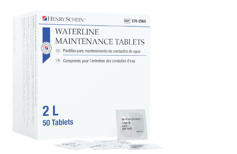 WATERLINE DISINFECTION BRAND PRODUCTS DENTAL UNIT WATERLINE MAINTENANCE TABLETS ADVANTAGES • Compliant - Tablets exceed the ADA and CDC guidelines for clean water by 50X, maintaining 10 CFU/mL or less, when used as instructed. • Easy to Use - Simply place a tablet in your empty dental unit waterline bottle every time you refill it. • Effective - Tablets may be left in waterlines overnight and for extended periods of non-use. They have been shown to be effective for up to 28 days. • Safe, Odorless, and Tasteless - Tested for no ill-effect on bonding or equipment. 50 Tablets/Box 2L 570-2560 | 750mL 570-2561 NEW Henry Schein® Waterline Maintenance Tablets. TRUST OUR EASY-TO-USE TABLETS FOR RELIABLE SAFETY AND COMPLIANCE. KEEP YOUR PRACTICE SAFE AND COMPLIANT henryschein.com.au | 1300 65 88 22 henryschein.co.nz | 0800 808 855 VIEW RANGE