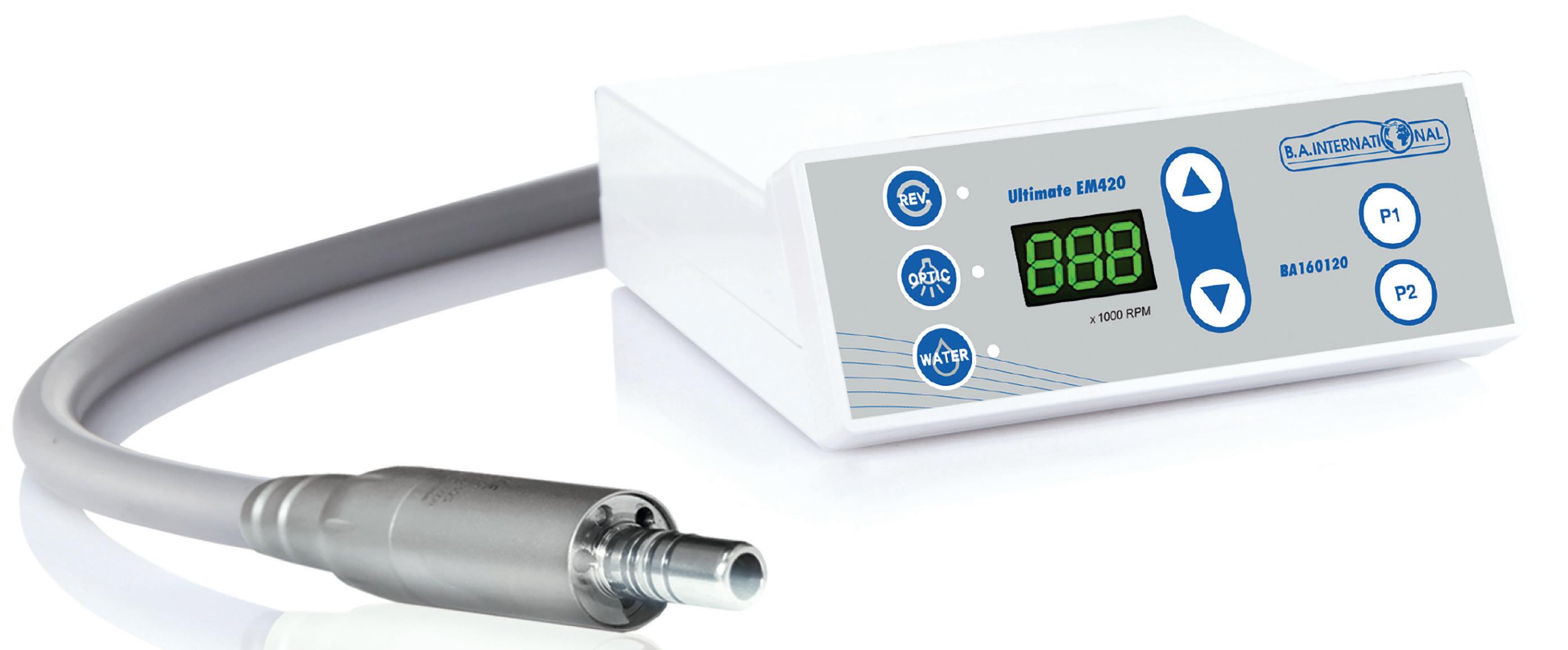 Ultimate EM420 Plug & Play Electric Micromotor EM420 electric micromotor - connects to your chair’s air supply for easy and cost-efficient conversion to electric. Particularly suitable for speed-increasing (red band) handpieces. Easy installation, plug and play unitno technician call out required. Electric micromotor with internal spray and LED light. Speed range: 1,000-40,000rpm. Brushless motor technology ensures long life cycle. Easy to install and operate. 2 programmable memory functions. Only £769 RRP £995 Bundle Offer EM420 with a 1:5 handpiece BA200LTS or BA250LT EM420+BA200LTS £1039 RRP £1,784 EM420+BA250LT £929 RRP £1,624 2 YEAR WARRANTY 1 YEAR WARRANTY UNIT 3 YEAR WARRANTY Electric Micromotor TOPSELLER 2 Order online at henryschein.co.uk