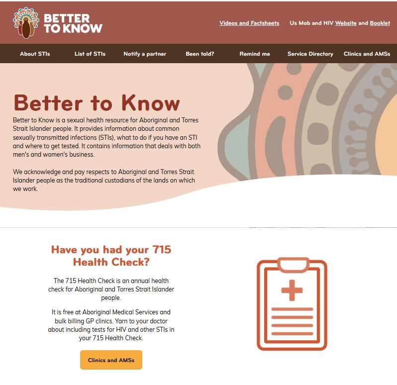 Sexual health resource for Aboriginal and Torres Strait Islander people with information about common STIs, what to do and where to get tested. bettertoknow.org.au