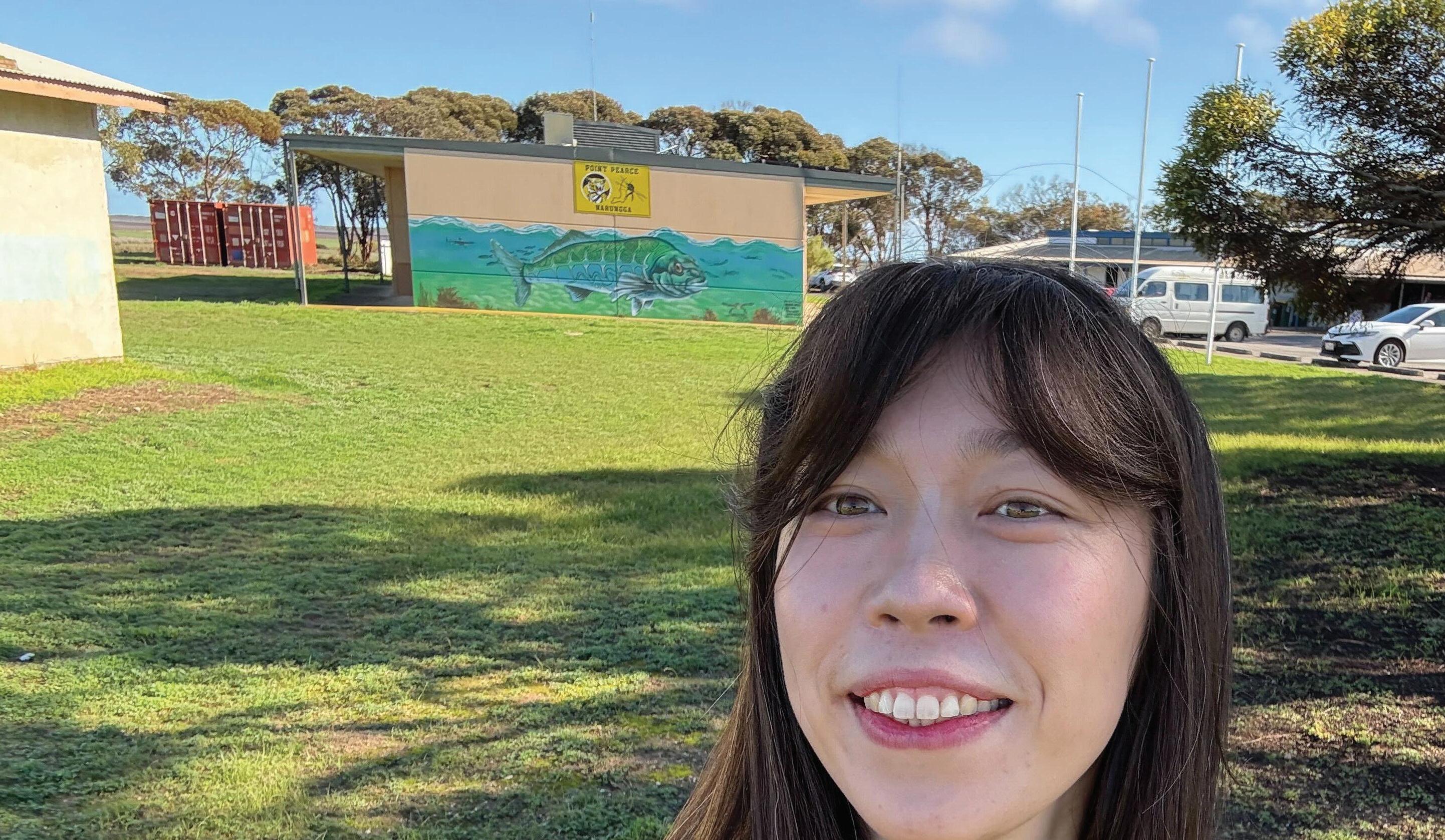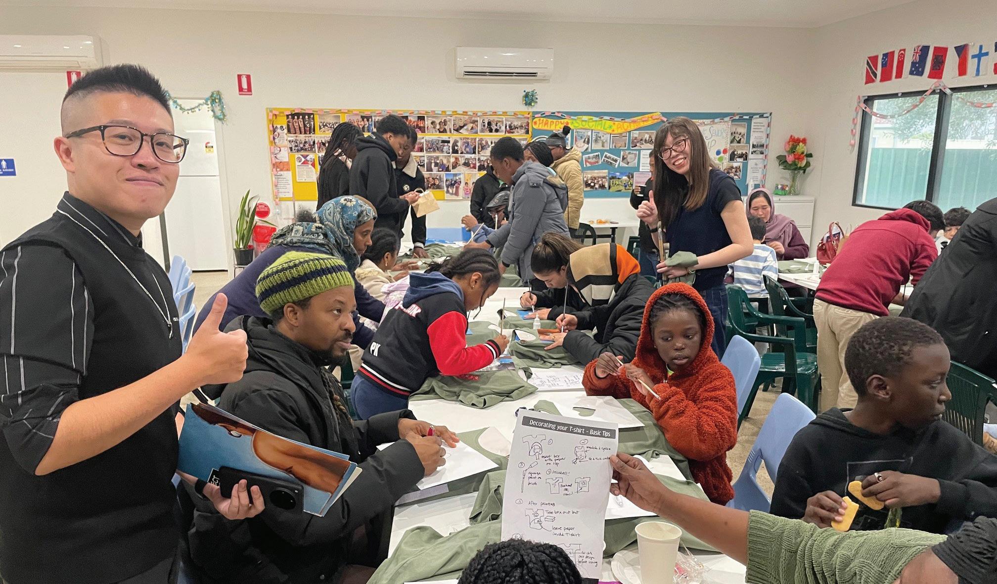 Clockwise: Parliament House glows green in 2023; Educator Yingbin in Point Pearce; and T-shirt painting at the Migrant Resource Centre