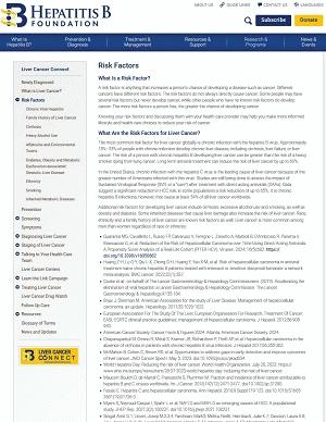 Hepatitis B Foundation, Doylestown PA, 2025. Webpage. Provides information about the major risk factors for liver cancer - hepatitis B and hepatitis C. Outlines additional risk factors including cirrhosis, excessive alcohol use and smoking, as well as obesity and diabetes.