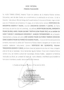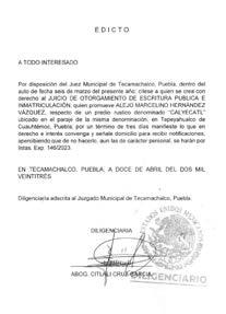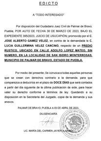 Disposición Juez Municipal de San Jerónimo Xayacatlan, Puebla; expediente 98/2023, Juicio Especial de Rectificación de Acta de Nacimiento; promueve ANITA CENOVIO VAZQUEZ a efecto de que se asiente correctamente mí nombre: ANITA CENOVIO VAZQUEZ, como fecha de nacimiento el DIECINUEVE DE MAYO DE MIL NOVECIENTOS SETENTA Y UNO como lugar de nacimiento SAN BERNARDO, ACATLÁN, PUEBLA; sexo FEMENINO, presentada VIVA, nombre de mi padre LUIS CENOVIO RODRIGUEZ, nombre completo de mi madre MARTINA VAZQUEZ REYES, nombre del abuelo paterno CAMILO CENOVIO, nombre de la abuela paterna FELICITAS RODRIGUEZ, nombre del abuelo materno SILVINO VAZQUEZ, nombre de la abuela materna SENORINA REYES, número de acta 158 CIENTO CINCUENTA Y OCHO. emplácesele mediante EDICTO a toda persona que pudiera tener interés en contradecir demanda para que comparezca en termino de tres días para hacer valer su derecho, de no hacerlo se tendrá por perdido su derecho, quedando en secretaria del juzgado copias de la demanda, anexos y auto de admisión para que se impongan de la misma. San Jerónimo Xayacatlan, Puebla; veintiocho de abril de dos mil veintitrés. Diligenciario Abogado Jorge Pedro González Ariza
