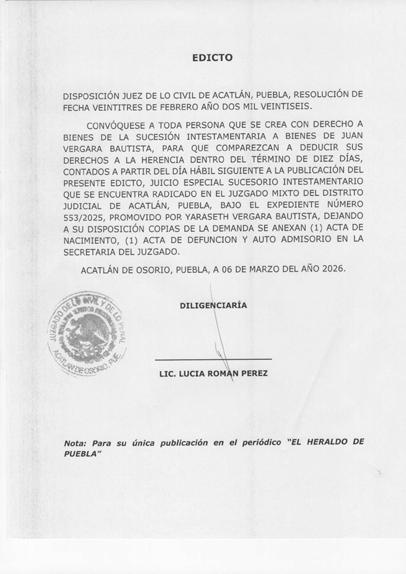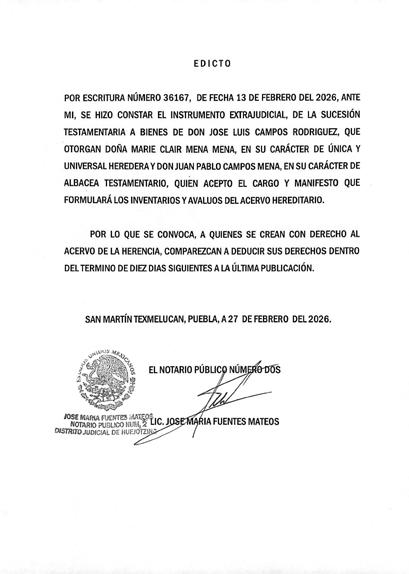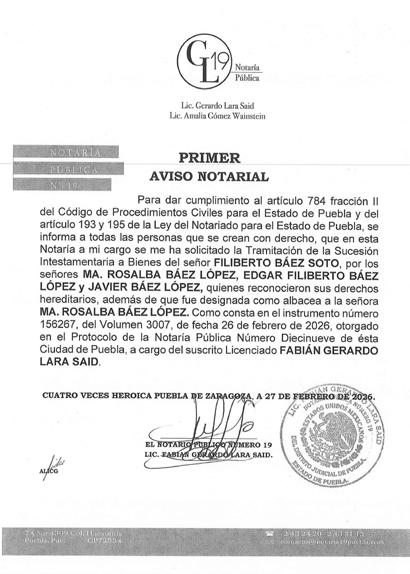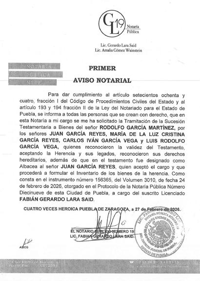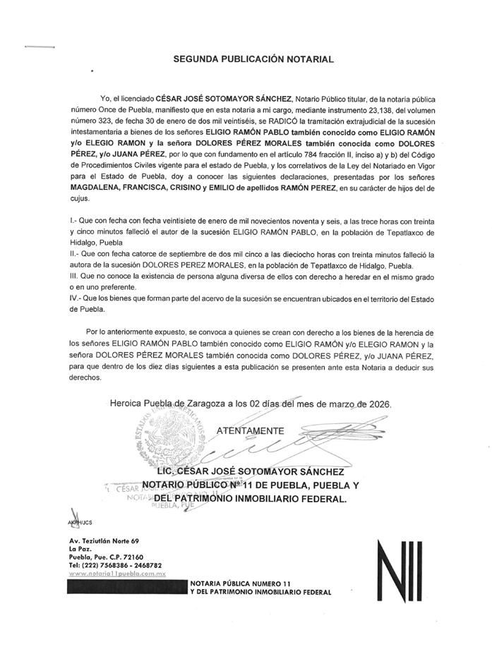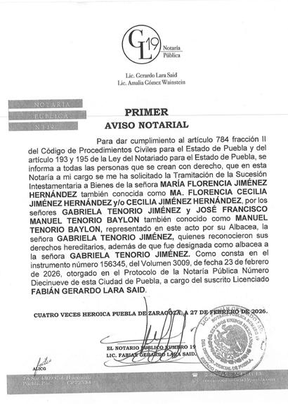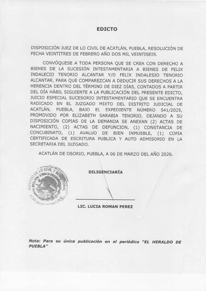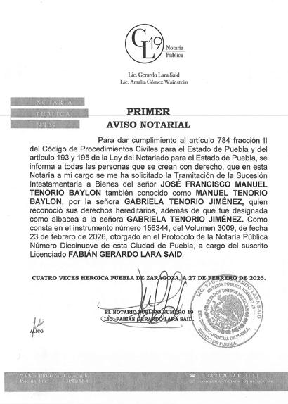 AVISO NOTARIAL DE CONFORMIDAD CON EL ARTICULO 784 DEL CÓDIGO DE PROCEDIMIENTOS CIVILES PARA EL ESTADO, EL SUSCRITO TITULAR DE LA NOTARÍA PÚBLICA NÚMERO SIETE DEL DISTRITO JUDICIAL DE TEHUACÁN, PUEBLA, DOY A CONOCER QUE EN LA NOTARÍA DE LA CUAL SOY TITULAR, A TRAVÉS DEL INSTRUMENTO PÚBLICO NÚMERO 16865 DEL VOLUMEN 254 DE FECHA 18 DE FEBRERO DEL AÑO EN CURSO, SE LLEVÓ A CABO EL INICIO DE LA TRAMITACIÓN EXTRAJUDICIAL DE LA SUCESIÓN INTESTAMENTARIA A BIENES DE LA SEÑORA MARÍA DOLORES ALARCON JAIME, QUIEN TAMBIÉN FUE CONOCIDA COMO DOLORES ALARCON y/o DOLORES ALARCON DE TOBÓN, QUE FORMULAN RICARDO TOBÓN ALARCON, ENRIQUE TOBÓN ALARCON y MARGARITA TOBÓN ALARCON, EN SU CARÁCTER DE HERMANOS CONSANGUÍNEOS DE LA AUTORA DE LA SUCESIÓN, RECONOCIENDO: A).- QUE LOS COMPARECIENTES NO CONOCEN DE LA EXISTENCIA DE PERSONA ALGUNA DIVERSA DE ELLOS CON DERECHO A HEREDAR EN EL MISMO GRADO O EN UNO PREFERENTE AL DE ELLOS MISMOS. B).- LOS DERECHOS HEREDITARIOS DE ESTA SUCESIÓN. C).- QUE EN VIRTUD DEL INFORME EXPEDIDO POR LA DIRECCIÓN DEL ARCHIVO DE NOTARIAS DE ESTADO DE PUEBLA CON NUMERO DE OFICIO CJGE-DGN-DAN-VD-0269/2026, NO SE ENCONTRÓ DISPOSICIÓN TESTAMENTARIA ALGUNA HECHA POR EL EXTINTO. LO ANTERIOR A EFECTO DE CONVOCAR A QUIEN O QUIENES SE CREAN CON DERECHO A LOS BIENES DE LA HERENCIA, PARA QUE SE PRESENTEN DENTRO DE LOS DIEZ DÍAS SIGUIENTES AL DE LA ÚLTIMA PUBLICACIÓN, A DEDUCIR SUS DERECHOS. ATENTAMENTE SUFRAGIO EFECTIVO NO REELECCIÓN. TEHUACÁN, PUEBLA, A LOS 18 DÍAS DEL MES DE FEBRERO DE 2026 TITULAR DE LA NOTARIA PÚBLICA NUMERO SIETE. LIC. JOSÉ LUIS SALGADO VÁZQUEZ. Para su publicación por dos veces en un término de diez días en el Periódico “El Heraldo de Puebla”. ANUNCIATE