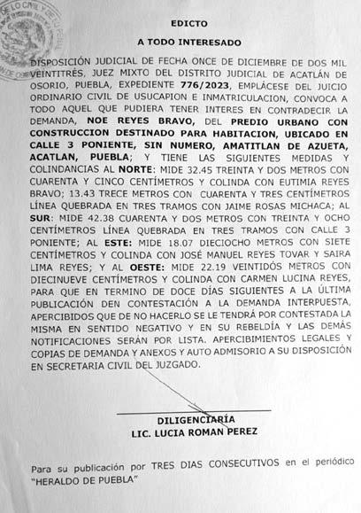 EDICTO A “TODO INTERESADO” Por disposición del Ciudadano Juez de lo Civil de Palmar de Bravo, Puebla, POR AUTO DE FECHA VEINTE DE JUNIO DE DOS MIL VEINTICUATRO, BAJO EL EXPEDIENTE 673/2024, JUICIO DE USUCAPIÓN; promovido por el C. GABRIEL SILVA GAMEZ, en contra del demandado el C. JOSE REYES Y/O JOSE REYES LAZARO, respecto de UN PREDIO RUSTICO DENOMINADO “EL ZORRILLAL” UBICADO EN LA POBLACION CUACNOPALAN PERTENECIENTE AL MUNICIPIO DE PALMAR DE BRAVO, PUEBLA, PREDIO RUSTICO ACTUALMENTE UBICADO EN LA POBLACION DE CUACNOPALAN PERTENECIENTE AL MUNICIPIO DE PALMAR DE BRAO, PUEBLA. Por medio del presente; Se convoca a todas aquellas personas que se crean con derechos contrario a la demanda, para que comparezca a deducirlos en el plazo de DOCE DÍAS que será contados a partir del día siguiente de la última publicación de este, para hacer valer su derecho conforme a términos de ley. Quedando a su disposición en la Secretaría del Juzgado, copia de la demanda y sus anexos. PALMAR DE BRAVO, PUEBLA A 29 DE JULIO DE 2024. DILIGENCIARÍA LIC. MARÍA DEL CARMEN JAVIER ALONSO.