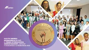Cemex recibió uno de los sie te reconocimientos que forman parte del premio internacional “Andrew Maskrey, impulso y ex celencia a la resiliencia 2022”, en su categoría de empresa, otor gado por la Asociación Nacional de Profesionales en Resiliencia, A.C., (Anprogeri), por reducir ries gos y responder de inmediato ante una contingencia.